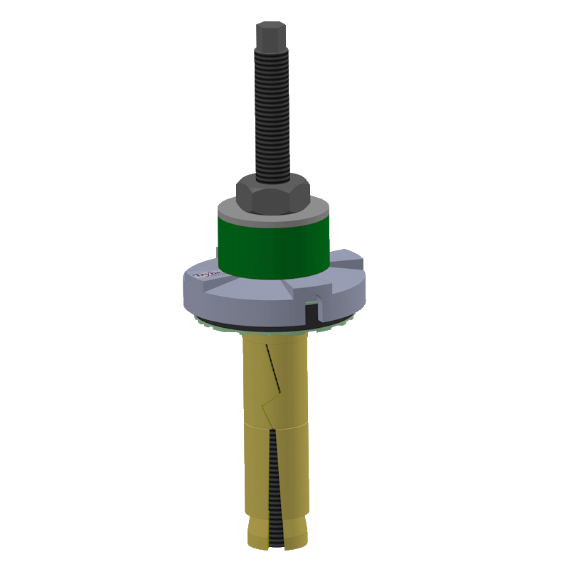 Dynemech DLT series mounts are used in the machines which must be anchored to the floor along with levelling and vibration reduction. Bolts with thru holes are provided in the machine foot, mount and anchored in the floor nut. an insulating disc is provided between the nut and the machine foot to prevent vibration from transmitting in the floor via the bolt. the dimple and the thru hole in the mount are provided as per the bolt specifications of the machine.